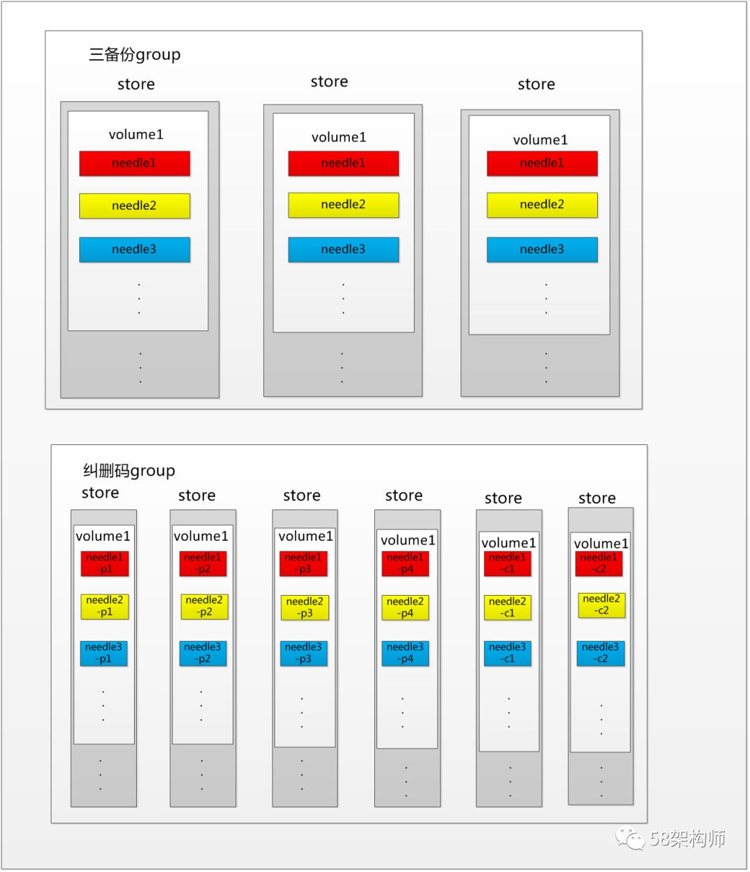 我们保持原有的存储结构,还是用group来管理store,三备份下一个group管理3个store,每个store中存放一份needle的副本,纠删码情况下,我们以4+2编码为例,一个group下管理6个store,同时这6个store管理的volume标识为EC类型,每个store存放原needle的一个分片和2个新产生的编码分片,6个分片分别放到每个store的同样编号的volume中,在分片的头部字段标识身份。这样,我们将存储空间从3倍缩减到1.5倍,整体存储结构如下图所示: