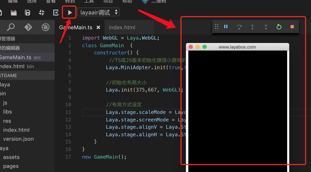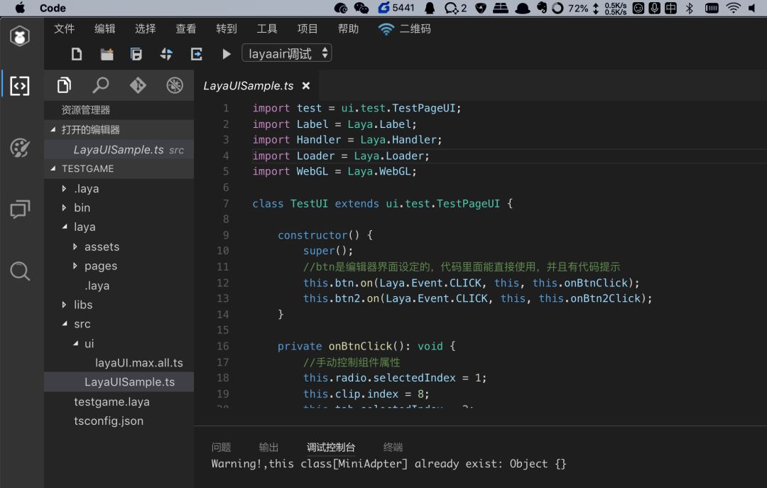 只是调试起来就有点蛋疼了,得Laya里写好,发布到release/wxgame,再在微信开发者工具里调试。