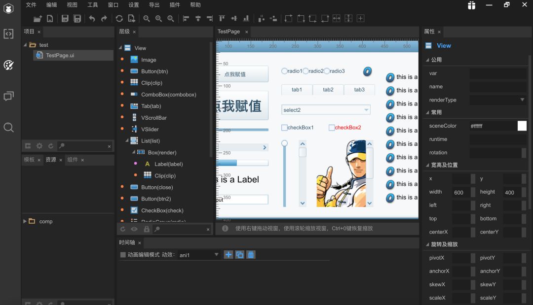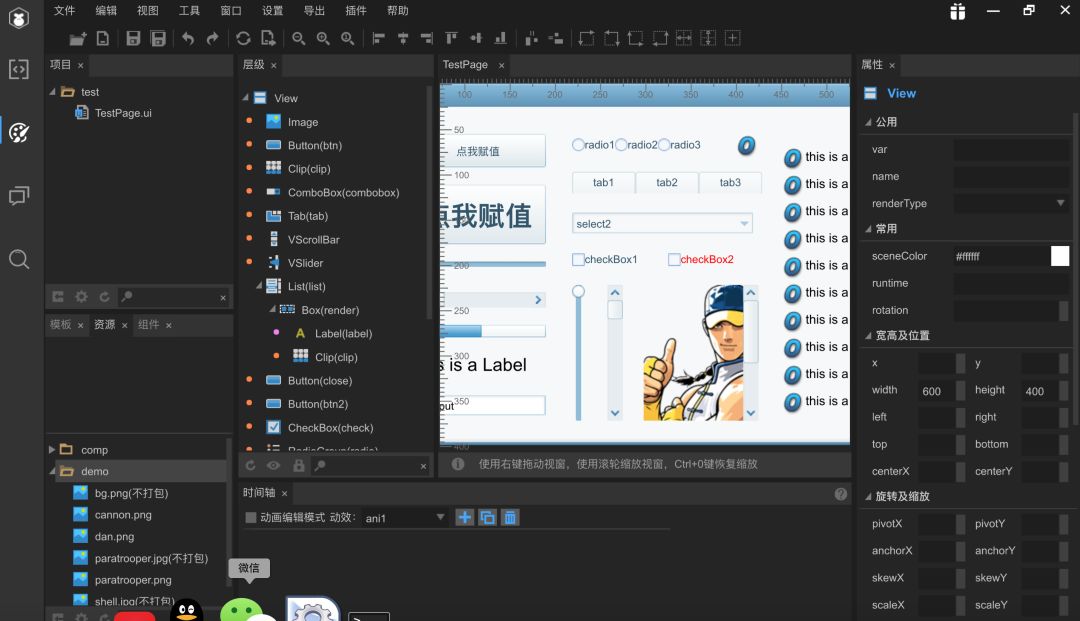 就是用来设计UI界面的地方,拖拖拽拽就可以把游戏页面整出来。Laya提供了好多组件,如果有需要的可以使用,当然也可以不用他的组件,自己搞自己的自定义组件。