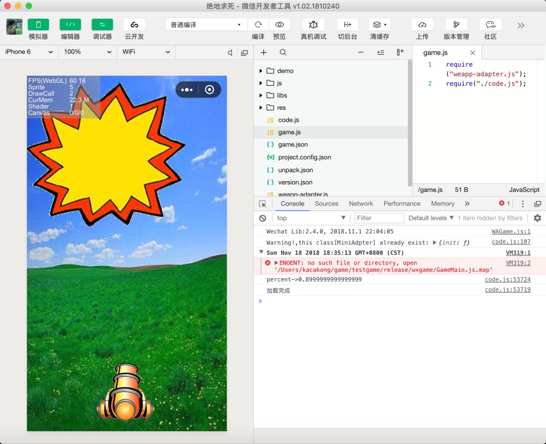 使用微信开发者工具打开,已经可以完美运行了。而且我们发现laya把我们刚才写的代码,和Laya的核心库一起,都被打包成一个code.js了。