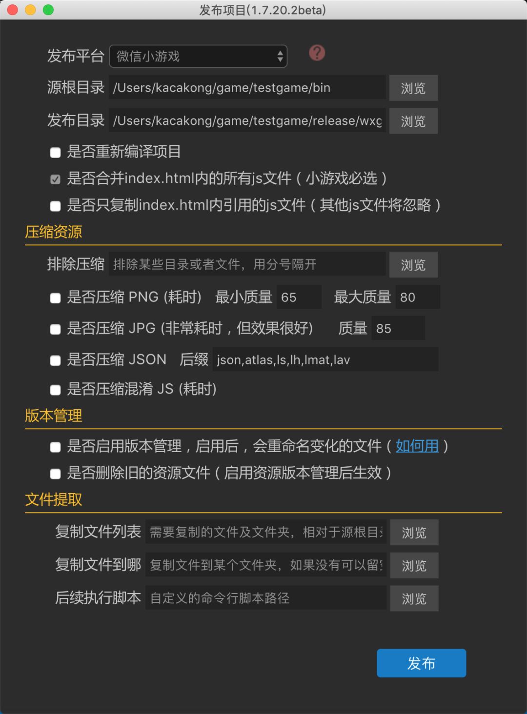 点击 进入发布界面,在发布平台选择“微信小游戏”,此时生成可以在微信开发者工具下运行的release/wxgame版本
