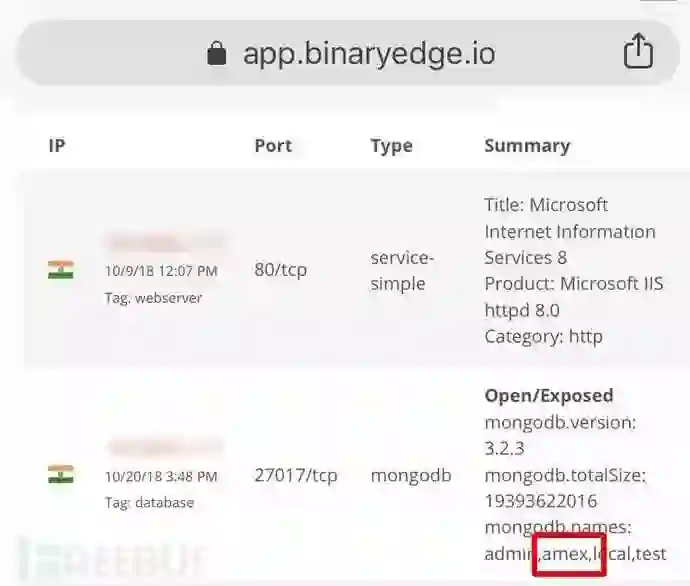 根据相关数据显示,这些记录似乎都来自印度的美国运通分公司。值得注意的是,在操作过程中并不需要使用任何特殊的程序,仅仅是通过Shodan一类的物联网搜索引擎或BinaryEdge.io来进行查找就可以得到相应的信息。