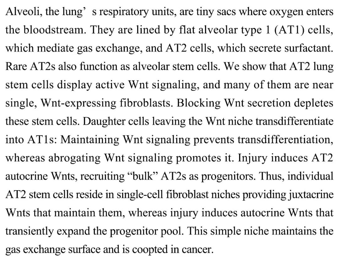 (导读 阿金)肺泡内壁上有介导气体交换的 AT1 细胞和分泌表面活性物质的 AT2 细胞。本研究表明在表达 Wnt 的单个成纤维细胞附近,AT2 干细胞可以显示出活跃的 Wnt 信号传导。而阻断 Wnt 传导会失去这些干细胞。离开 Wnt 微环境的子细胞则会转分化为 AT1 细胞。这个简单的 Wnt 微环境能够维持肺泡表面气体交换。