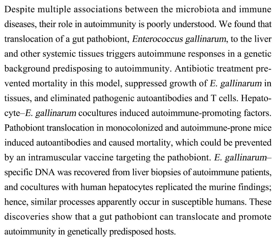 (导读 齐睿娟)微生物群与免疫性疾病存在诸多关联,其作用机制仍待阐明。本研究指出在自身免疫疾病易感的遗传背景下,肠道致病菌鹑鸡肠球菌(E. gallinarum)如果易位到肝脏和周围组织,即可触发自身免疫性疾病。E. gallinarum 可诱导组织细胞中产生自身免疫促进因子,而抗生素可抑制组织中肠球菌的生长,并清除致病性自身抗体和 T 细胞。该机制在人体中也同样可以观察到,说明肠道致病菌的易位与自身免疫疾病的关联。