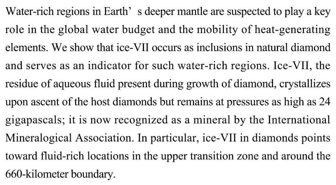 (导读 阿金)地幔深处的富水区域被怀疑影响全球水平衡和发热元素移动。本研究展示天然钻石中存在矿物冰七,冰七是钻石生长向上移动时,残留的极高压的水流体,该矿物指示地球内部过渡带上层和 660 公里边界附近的流体富集区域。