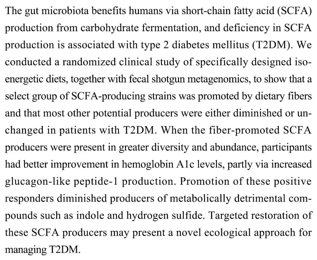 (导读 郭怿暄)肠道微生物组可以通过碳水化合物发酵产生短链脂肪酸(SCFA)使人类获益,SCFA 产生不足与 2 型糖尿病(T2DM)相关。本研究通过等能量饮食随机临床试验和粪便鸟枪法宏基因组学研究发现 T2DM 患者中膳食纤维可选择性促进 SCFA 生成细菌株的存活,当其达到更大的多样性和数量时,患者糖化血红蛋白有效改善,代谢废物吲哚和硫化氢产量降低,提示一种处理 T2DM 的全新生态学方法。