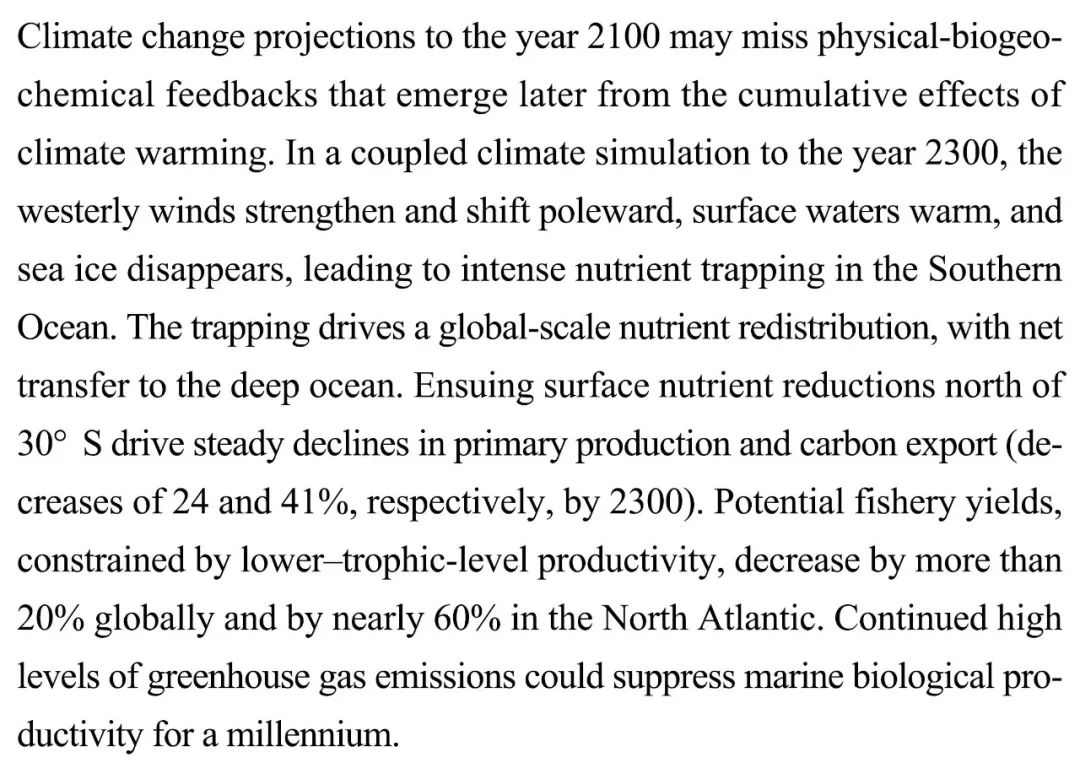(导读 阿金)在到 2300 年的气候耦合模拟中,西风增强并向两极转移,地表水变暖,海冰消失,南部海洋滞留大量养分,北纬 30 度以北海洋表面养分减少使得初级生产力和碳输出下降。受限于低营养水平生产率的全球渔业全产量降幅超过 20%。温室气体持续高排放量对海洋生产力的抑制可达千年。