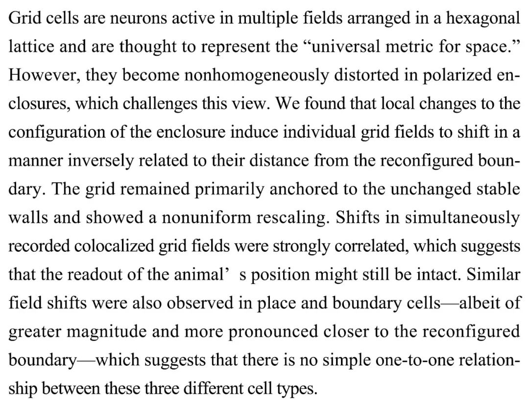 (导读 寒雨)大脑中网格细胞的放电野曾被认为与观察区内的空间位置一一对应,但观察区大小会改变网格细胞网络模式的发现对此提出挑战。本研究发现此种改变与各网格细胞与变化边界的距离成反比,也就是远离变化位置的网格细胞放电野保持稳定,仍可提供稳定的空间感知。类似的转变在位置细胞和边界细胞中也存在,表明这三种细胞间不存在简单的一对一关系。
