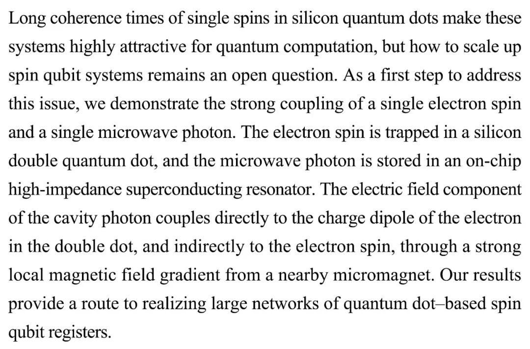 (导读 甜甜)如何在硅量子点中增大自旋量子位的规模一直都是一个难题。本研究展示了单电子自旋和单微波光子的强耦合。电子自旋被困在硅双量子点内,微波光子储存于高阻抗超导共振腔内,通过腔光子的电场分量间接耦合电子自旋。研究结果为实现基于自旋量子位寄存器的大型网络化提供了一个途径。
