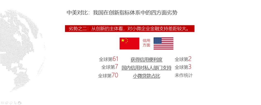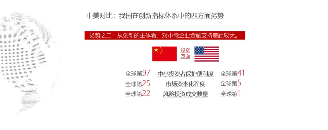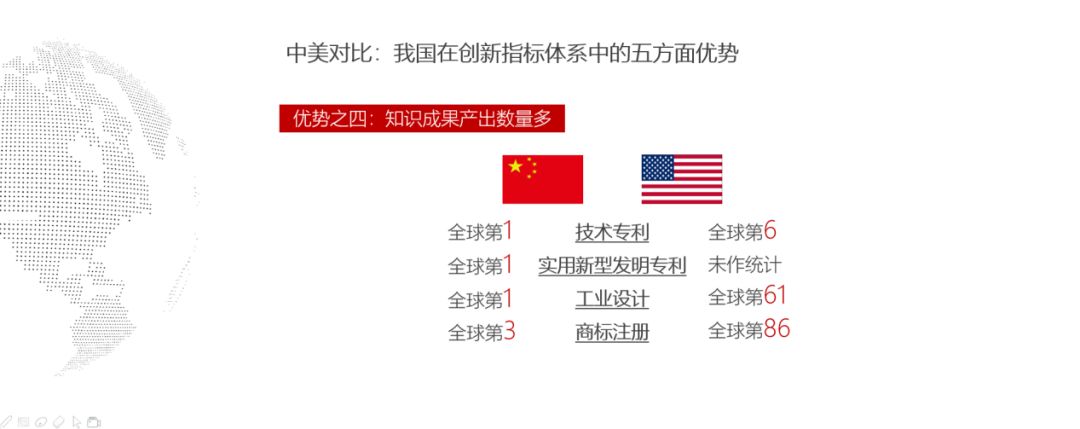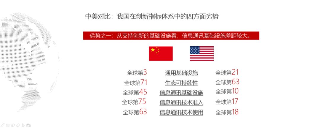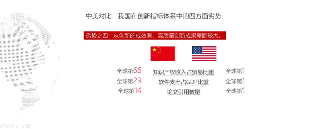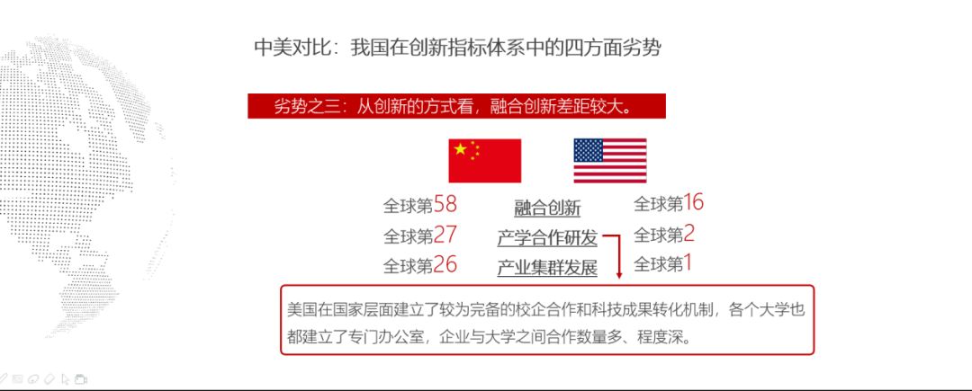 优势讲完了。我非常强调的是,大家要关注中美两国在创新指标体系中,中国的弱势在哪里。这就是我们下一步要改进的地方,我们说:缺憾即空间。