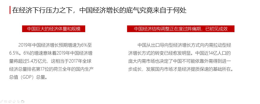 第一,市场规模。中国有23万亿美金,国际购买力的评价,中国高于美国。但是在增速方面,我们还有一些小的问题,人均总量不足。