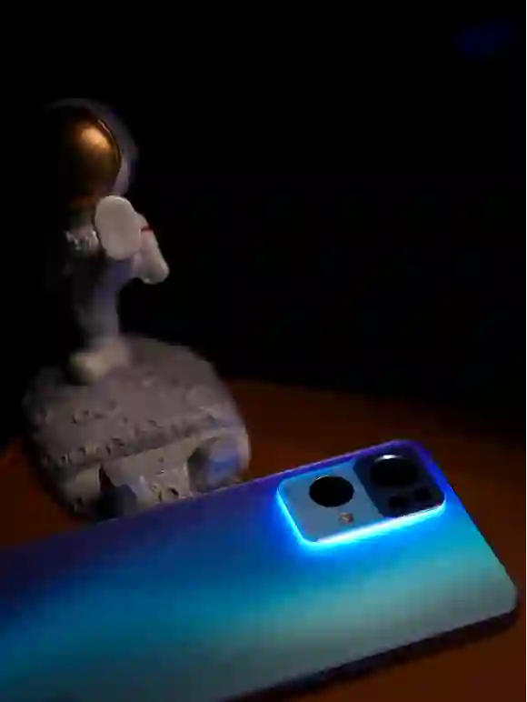 当你充电或者有应用通知的时候,后置主摄区域会有一圈光带,这是 OPPO 行业首创的光纤热弯星环呼吸灯。说来好笑,小时候特别喜欢手机上的呼吸灯,不仅是能知道有没有短信,在黑暗中伴随着呼吸一亮一灭,就让人觉得很高级。