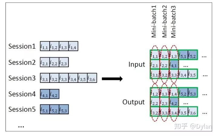 文章提出了一种Session-parallel mini-batch的方法,通过session粒度的并行极大加快了RNN-based模型的训练。这个工程层面的优化很巧妙,相当于将session样本分别放入BatchSize个队列中,step-by-step的进行训练。任意一个队列中出现session切换时,相应的GRU state将会被重置然后重新从序列起始开始训练(训练时构建BatchSize个GRU单元,每条队列对应的GRU有自己的hidden state,共享W/b网络参数)。