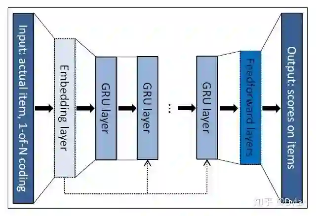 GRU4REC是一个单纯基于GRU的session sequence->next step的序列化预测模型(不同于sequence->target类型的序列化建模),每一个step 的输入经过embedding layer给到GRU,得到next step的预测。