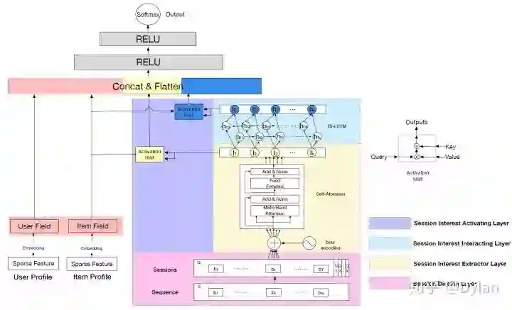 Session Division Layer将用户行为序列切到不同的session中(浅粉色);