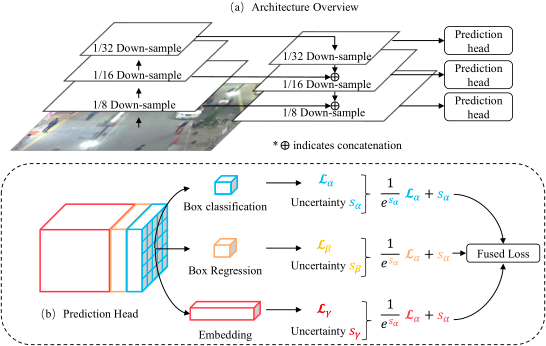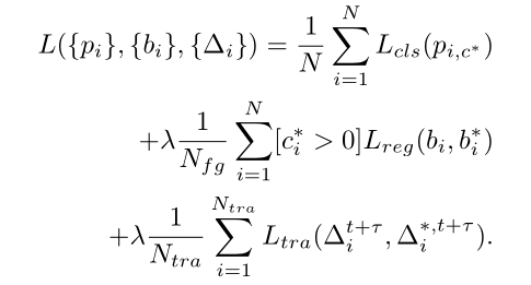 当然,跟踪分支只考虑与 gt 的 IOU>0.5 的预测框,并且目标要同时出现在这两帧。多任务损失函数如下:
