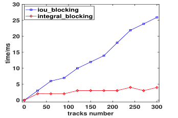 通过上面的分析,我们可以知道的是,数据关联部分的特征相似度计算,不仅要进行 n:m 的 Kalman 更新过程(为了求马氏距离),还要进行 m:(nxk) 的表观特征比对,这个过程很耗时。所以我们利用 3-D integral image 快速将空间区域分配,使得特征相似度计算过程的复杂度降至 O(m+n)。