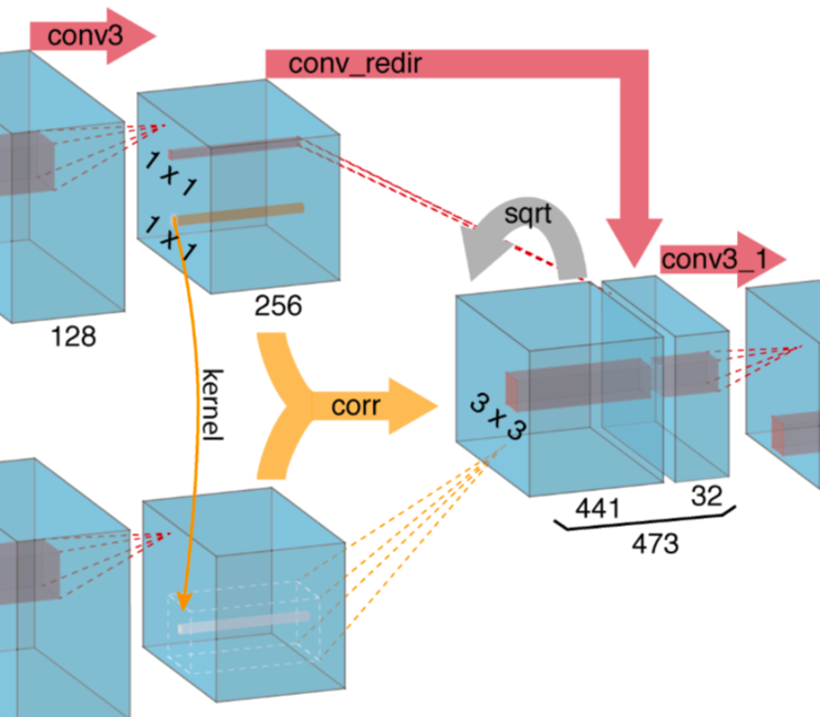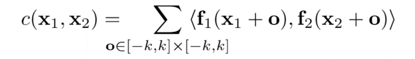 可以看到,这里的滤波不是对卷积核的,而是将两幅特征图的多个 kxk 的区域分别做相关滤波,从而保持了相对位置。