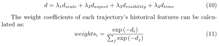 并在观测框和跟踪轨迹特征比对的时候,考虑了跟踪轨迹历史信息,来进行自适应加权: