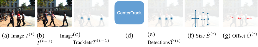 通过上图我们可以大致分析出算法框架,除了对相邻两帧利用 CenterNet 进行检测之外,还利用了上文中提到的 D&T 框架的策略,预测同时存在于两帧中目标的相对位移,由此进行跟踪预测。
