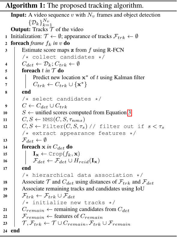 这篇论文表面看上基于 R-FCN 检测框架的 private 多目标跟踪算法,不过与上一篇不同的是,作者只利用 R-FCN 对观测框进行进一步的前景/背景分类,即用于目标框的分类过滤,而且 MOTDT 将检测和跟踪框架分离了。