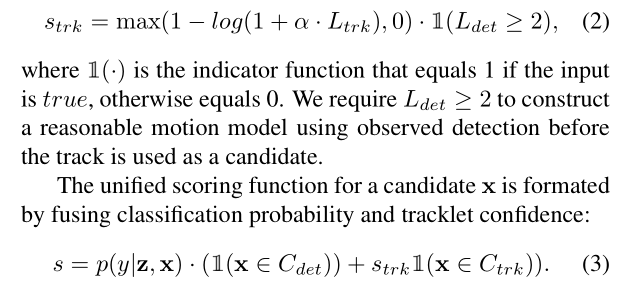 这里面 L 表示的长度,通过上面两个公式,作者将检测置信度和跟踪轨迹置信度结合在一起了。