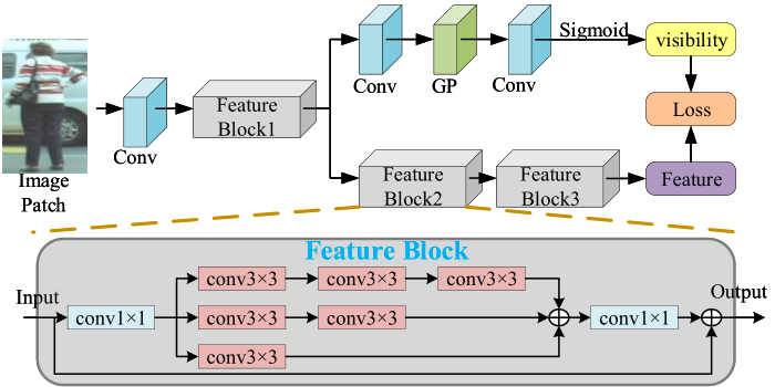 对于表观模型,我们考虑到特征对齐的因素,做了一点小改进,结合可视度预测设计了多任务的表观模型: