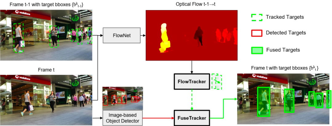 这篇文章也是基于 Tracktor++ 的模式,做了很直接的一步操作,即直接增加一个光流预测分支,将 Tracktor++ 中的 跟踪框+观测框 变成了 光流预测框+观测框