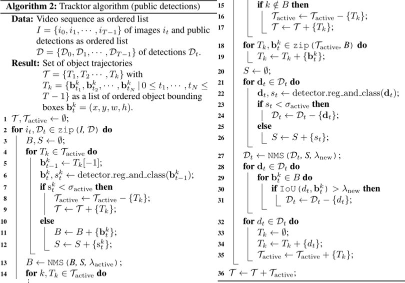 Tracktor++ 算法是去年出现的一类全新的联合检测和跟踪的框架,这类框架与 MOTDT 框架最大的不同在于,检测部分不仅仅用于前景和背景的进一步分类,还利用回归对目标进行了进一步修正。