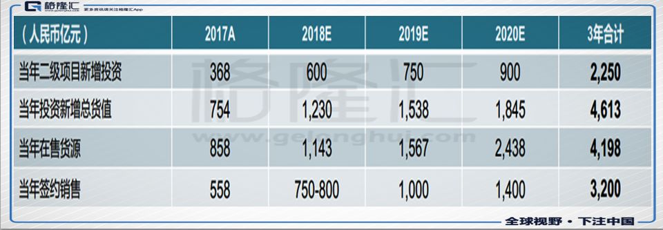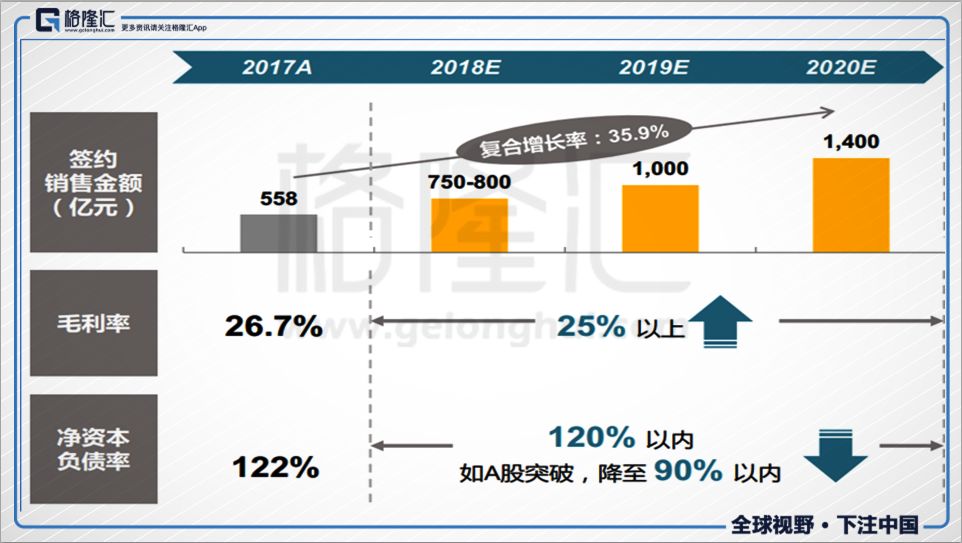 更重要的是,在业绩发布后,管理层发表了三年发展计划:“未来三年合计目标签约金额3200亿元,复合增长率35%以上。2018-2020年实现800亿、1000亿、1400亿的签约目标,同时控制毛利率在25%以上的水平,净负债率在120%以内,若回A股能突破,有望控制在90%水平。