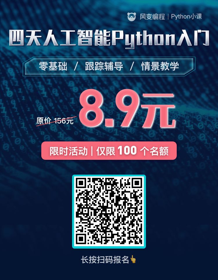这次我与python小课(风变编程)合作了「四天人工智能Python入门」,为小伙伴们争取到100个限时优惠名额。