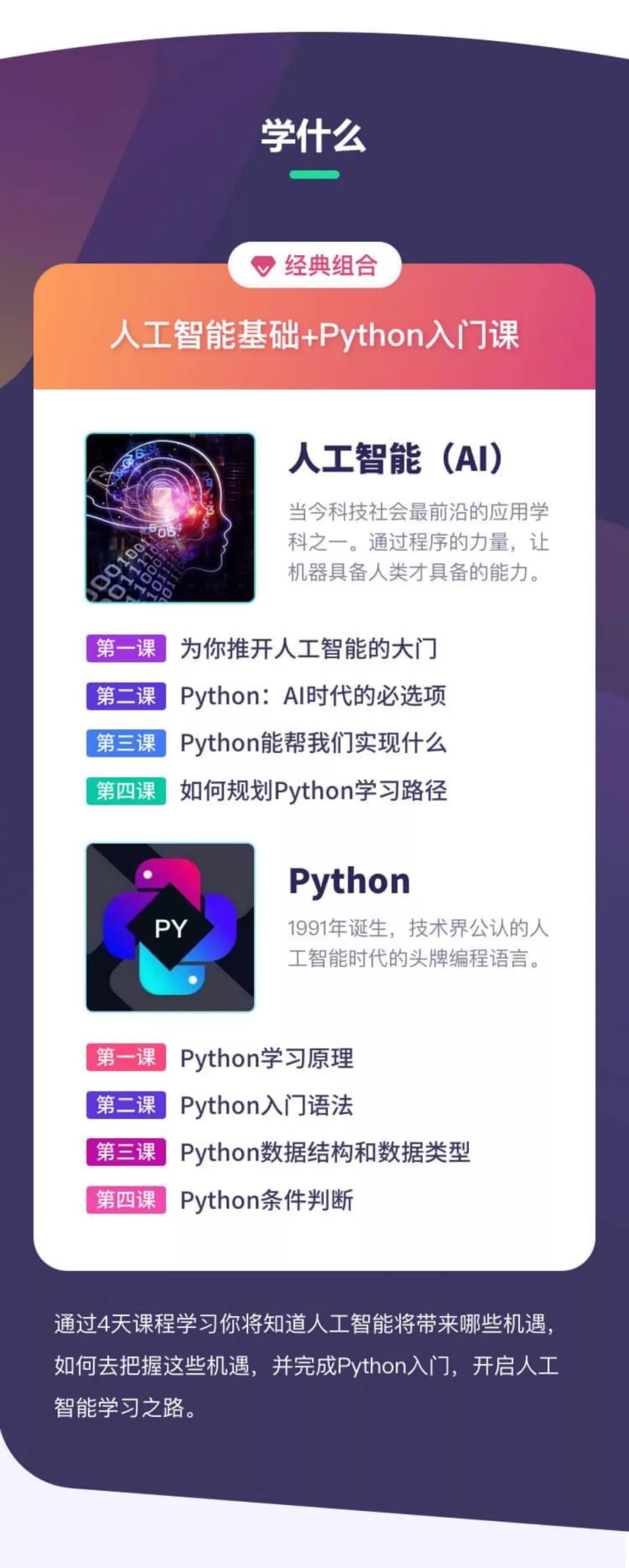 四天人工智能python入门课已经累计帮助了30万+小白用户,其中包括1/3的年轻女性,从零开始,爱上python,打开新世界第一步。