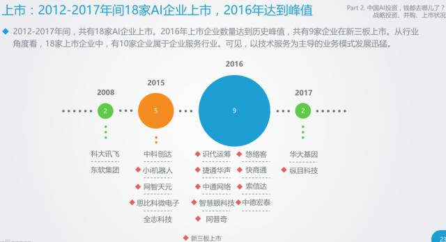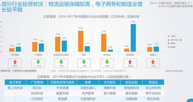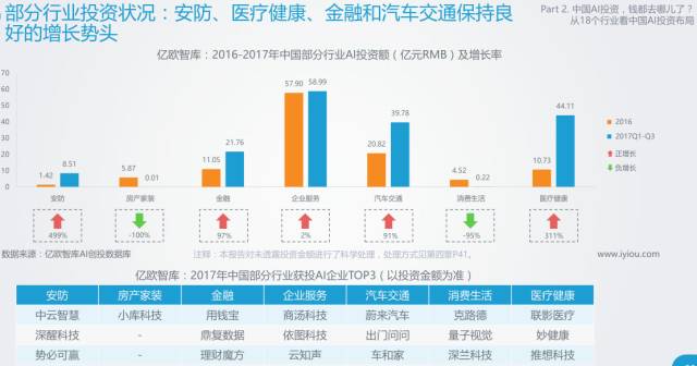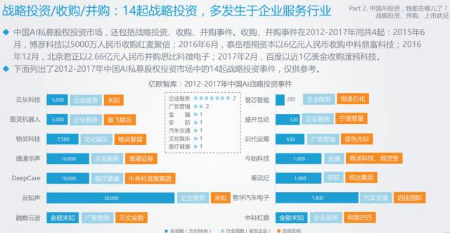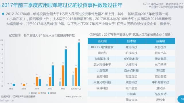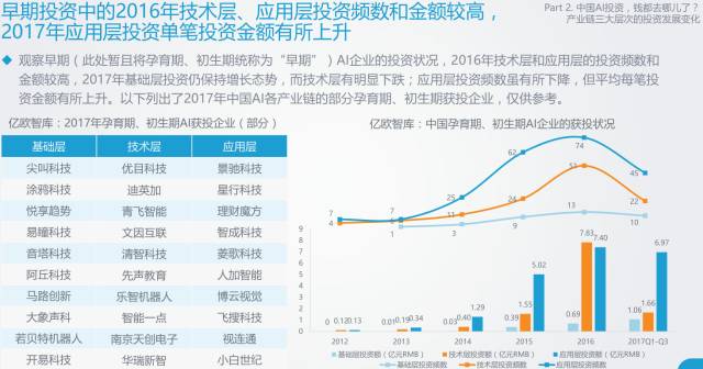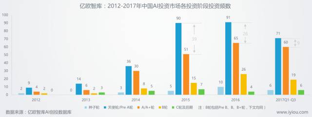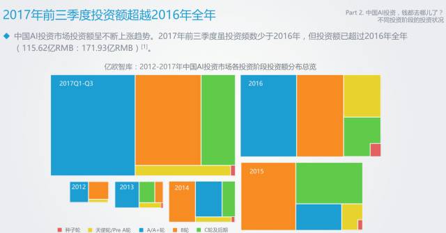 AI炙手可热。从各投资阶段投资频数角度审视,中国AI投资市场各阶段投资频数于2015年出现第一次大幅度增长;2017年前三季度投资频数虽低于2016年,但基于算数计算预估,2017年全年投资频数有望达到或略超过2016年。
