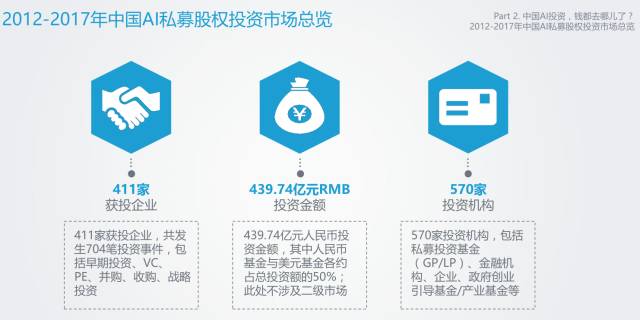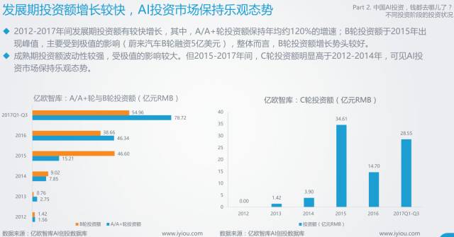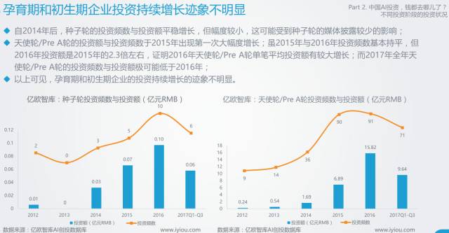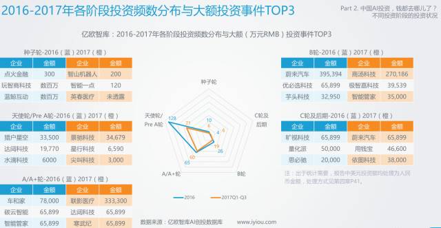 2. 发展期(A/A+轮、B轮)企业的获投频数稳步上升,并逐渐向初生期企业靠近,2017年表现更为显著。由此可以预测,2017年中国AI投资市场重心已开始向发展期转移。