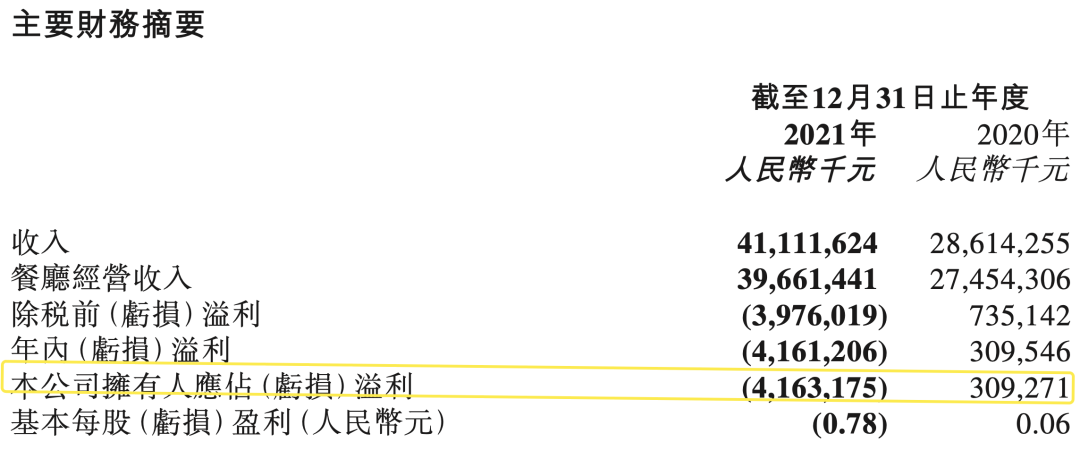 海底捞2021年收入及亏损情况,图据公司财报