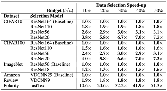 ,我们提出了一种将数据选择速度提高多达41.9倍的方法。我们使用一种规模较小、精度较差的模型作为规模较大目标模型的低代价的代理,并用此来选择用于训练的“核心”数据。尽管这些代理模型准确性较低,但它们选择的是不会对最终模型的准确性产生较大影响(通常在0.1%以内)的高质量数据。另外,在不影响ResNet-164模型准确性的情况下,上述代理模型可以清洗掉50%以上的CIFAR-10训练数据,从而使端到端模型的训练速度提升40%。