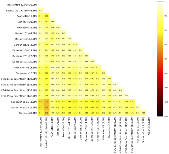 上图为在ImageNet数据集上PyTorch预训练模型与最大熵排名之间的Spearman相关性。大多数模型架构之间相关性很高。例如,MobileNet V2基于熵的排名与ResNet50模型高度相关,尽管该模型参数要少得多(3.5M vs 25.6M)。