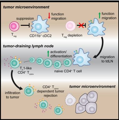 我们知道,肿瘤患者的外周血及肿瘤局部往往可以找到调节性T细胞(Treg细胞)的踪迹,有研究证实Treg细胞能够抑制免疫应答,因此研究人员猜想Treg细胞或许正是阻滞CD4+T细胞激活的元凶。研究人员去除了实验肿瘤小鼠体内的Treg细胞,发现cDC2可顺利迁移至肿瘤区域,同时小鼠的抗肿瘤免疫反应明显加强,而且他们证实这种免疫反应是依赖于CD4+T细胞产生的Treg细胞。