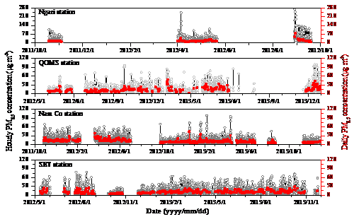 图1. 青藏高原背景大气细颗粒物PM2.5质量浓度的小时和日平均值
