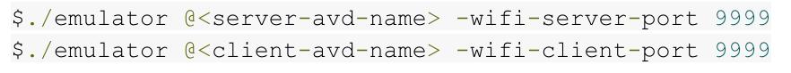 Android 9 Pie 模拟器系统镜像和 Wi-Fi P2P - 除了 Android 3.3 之外,您还可以为模拟器下载 Android 9 系统镜像文件,以便在本地进行应用测试。Google Play 模拟器系统镜像文件不仅具备 Android CTS (兼容测试套件) 认证,而且提供 Wi-Fi P2P 技术支持,允许两台模拟器以点对点形式直接互联。如需使用该特性,请通过以下命令行启动模拟器 (v28.0.22 或更高版本),并确保这两个模拟器共用一个 Wi-Fi 服务器和客户端口命令行参数。