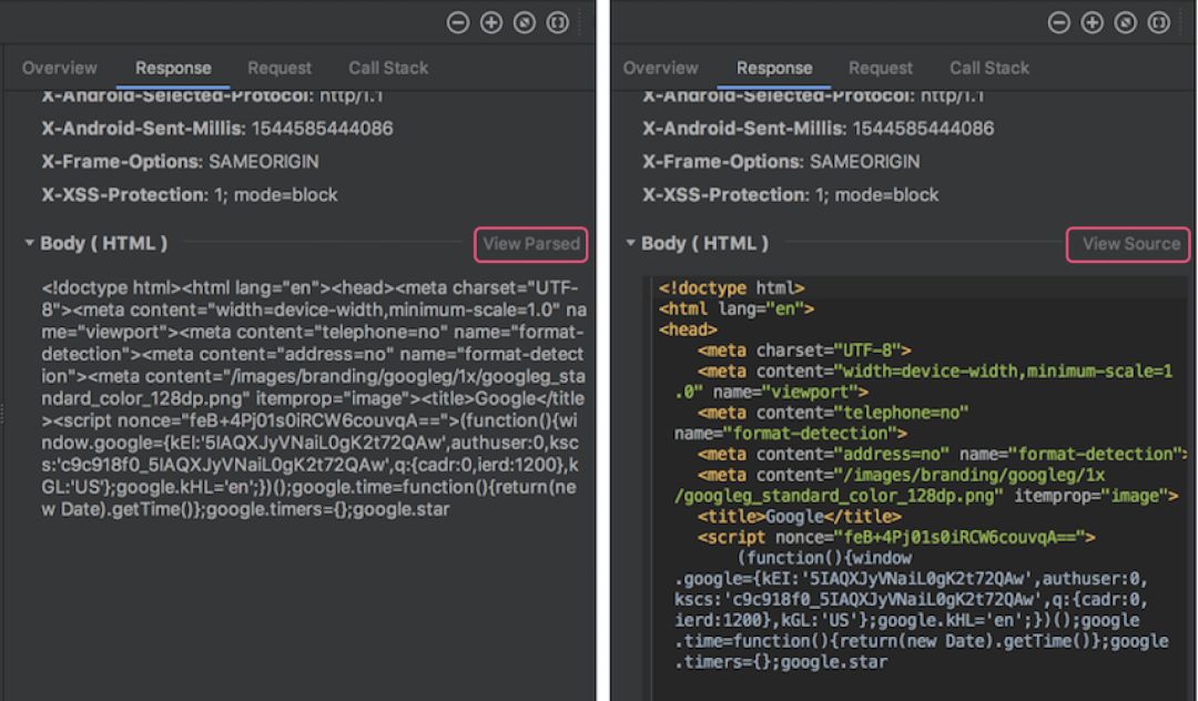 网络分析器的格式化文本支持 - 在默认设置下,Android Studio 3.3 中的网络分析器会对网络负载中的常见文本类型进行格式化操作,包括 HTML, XML 和 JSON。如果您需要在格式化文本和原始文本之间进行切换,请在标签栏中选择 Response 或 Request,然后点击 View Parsed / View Source 选项。更多内容,请阅读《利用网络分析器检查网络流量》。