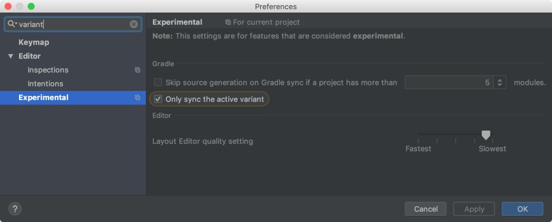单变体项目同步 - 如果应用项目的规模较大,而且需要同时维护多个构建变体,那么除构建速度以外,项目的同步速度也有可能成为开发瓶颈。该版本 IDE 允许开发者限定仅同步当前所选的变体。如需使用该优化,请确保项目已添加 Android Grandle plugin 3.3.0 或更高版本。该功能为实验功能,您需要在 Android Studio 3.3 中的实验偏好设置中手动开启。