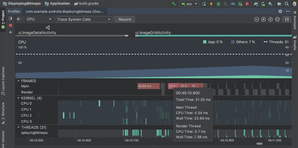 CPU 分析器支持帧渲染数据: 当您使用 Trace System Calls 进行记录时,CPU 分析器会显示UI 主线程和渲染线程每一帧的渲染时间。这些数据可以帮助您如果诊断出应用中 UI 卡顿的瓶颈所在和具体原因,并且为您指明优化方向。更多内容,请阅读《渲染过慢》。