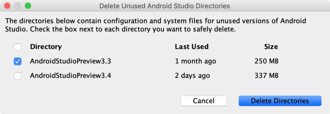 删除未使用的 IDE 目录 - 为了顺利升级至最新版 Android Studio, 您可以使用我们添加的一项新功能来清除未使用的设定和缓存目录。历史版本 Android Studio 会在硬盘中留下一些旧目录,它们既不容易找到,也不方便清除。当您第一次运行 Android Studio 3.3 (或更高版本) 时,新对话框会显示历史安装生成的目录,并提醒您进行安全删除操作。
