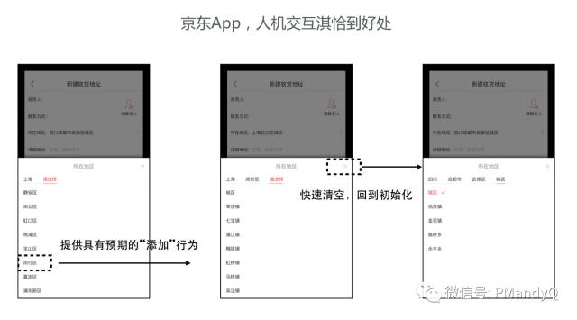 举例:京东App,发货地址选择地区时的交互流程,操作及反馈值得推荐,选中一层(省、市、区)则顺其自然的进入下一层选择,给人新增一条记录待添加的感觉,操作一气呵成。相反对比,把省、市、区作为Tab的Title的方式,让用户选择Tab,然后选择内容的方式。此交互体验更佳顺畅,且能解决用户点击层级深之后,短暂迷失方向的难题。