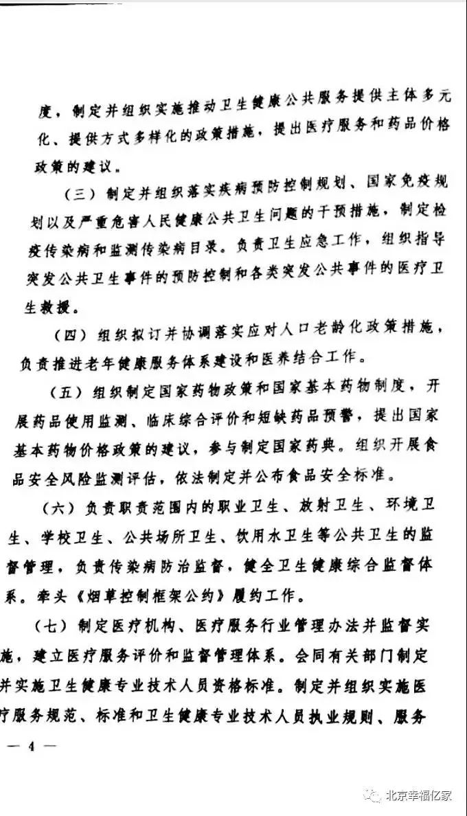 为此将国家卫生和计划生育委员会、国务院深化医药卫生体制改革领导小组办公室、全国老龄工作委员会办公室的职责,工业和信息化部的牵头《烟草控制框架公约》履约工作职责,国家安全生产监督管理总局的职业安全健康监督管理职责整合,组建国家卫生健康委员会,作为国务院组成部门。 保留全国老龄工作委员会,日常工作由国家卫生健康委员会承担。民政部代管的中国老龄协会改由国家卫生健康委员会代管。