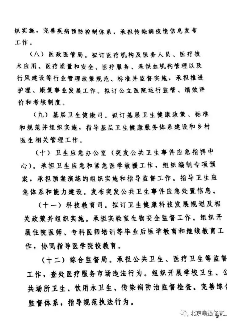 八、医政医管局。拟订医疗机构及医务人员、医疗技术应用、医疗质量和安全、医疗服务、彩供血机构管理以及行风建设等行业管理政策规划、标准并监督实施,承担推进护理、康复事业发展工作。拟订公立医院运行监管、绩效评价和考核制度。(原有)