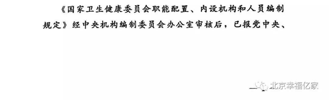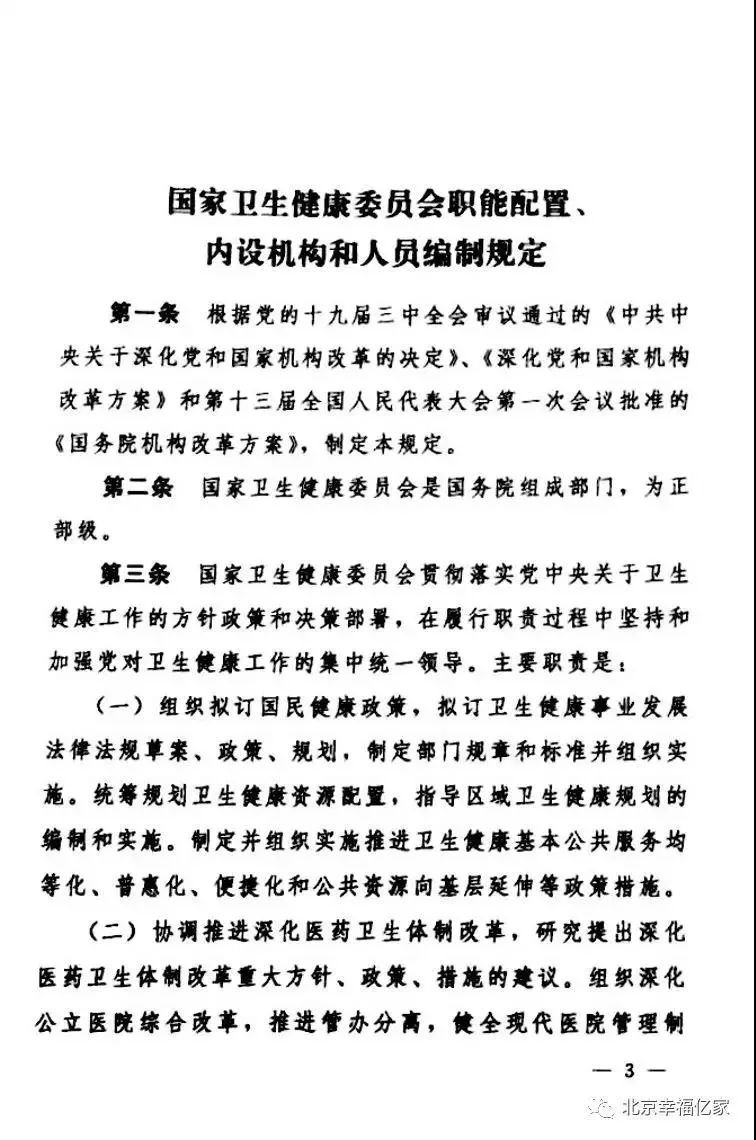 近日,一份由中共中央办公厅、国务院办公厅关于印发《国家卫生健康委员会职能配置、内设机构和人员编制规定》的通知在网间流传,根据该通知,大家关注的国家卫生健康委员会三定方案已确定并正式印发。