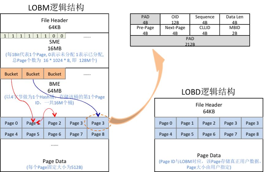 在巨杉数据库中,LOB存储结构分为元数据文件(lobm)与数据文件(lobd)。其中,元数据文件存储整个LOB数据文件的元数据模型,包括每个页的空闲状况、散列桶、以及数据映射表等一系列数据结构。而数据文件则存储用户真实数据,数据头之后所有数据页按照page size进行切分,每个数据页不包含任何元数据信息。