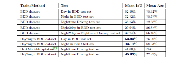 第二种选择是将带有语义分割标签的BBD训练集中的部分白天图像转换为夜间图像。然后将带有合成夜间图像的数据集用来训练ERF-PSPNet损失函数。这个想法来自于缺乏精确分割的夜间数据集标签。